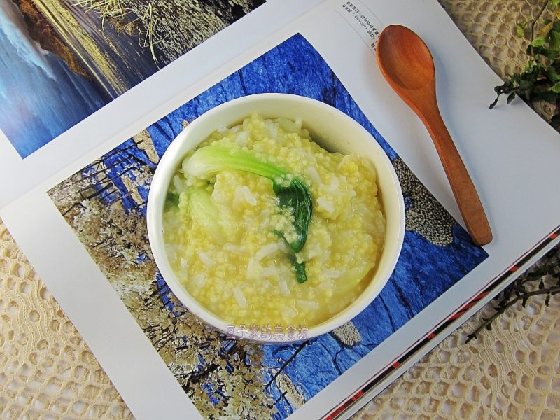 7:洗干净的油菜放进米粥里,再加一勺食盐。加盐要按照自家的口味加哈。如果掌握不了,就先品尝一下在加盐。