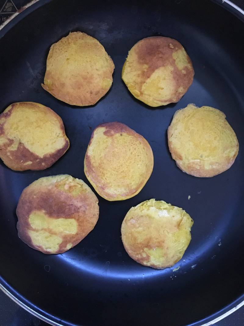 4:小火加热平底锅(不粘锅和电饼档也可以),一小勺可摊一个,煎黄翻面,切记小火,两面金黄出锅