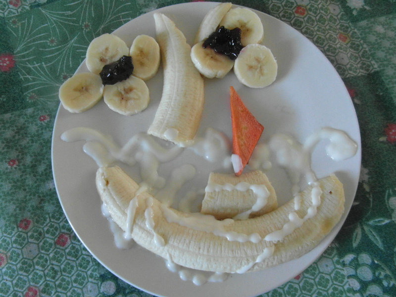 1:香蕉2根用来造型,蓝莓果酱用来装饰,酸奶或香甜味沙拉酱做波浪装饰。