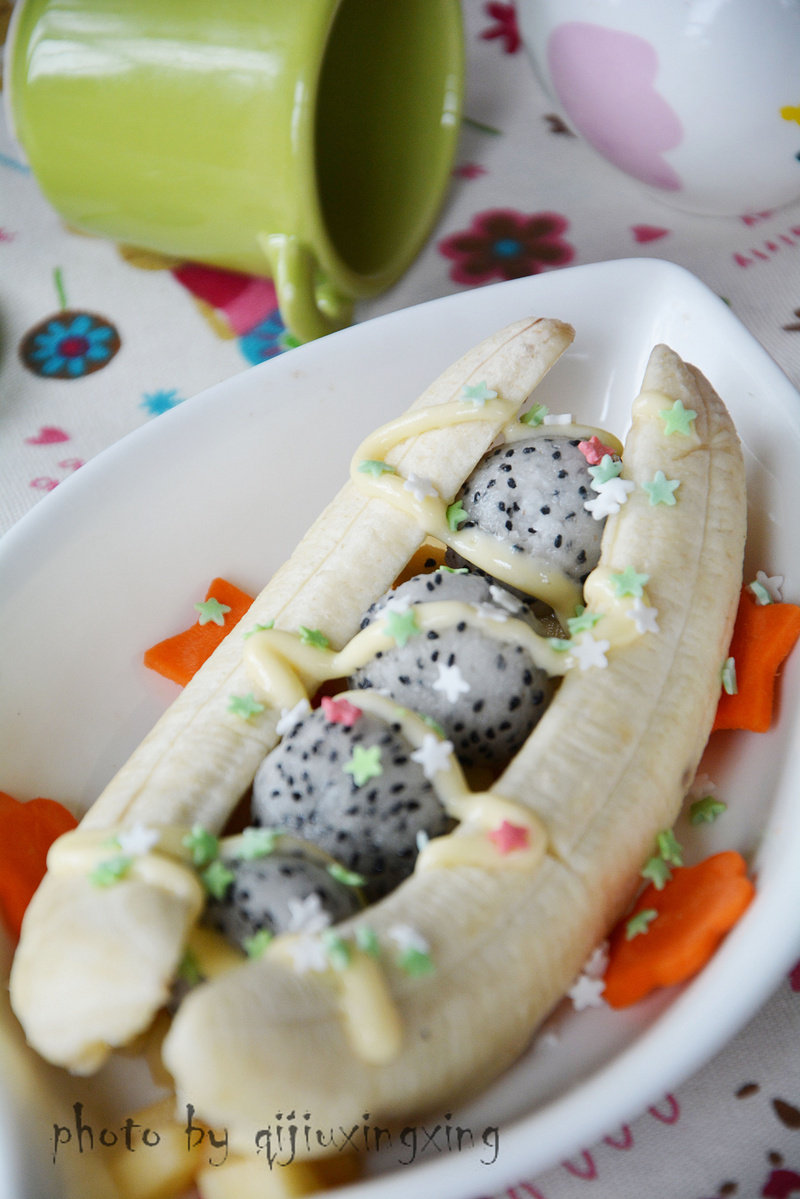 4:火龙果挖成球状,也摆在香蕉中间。