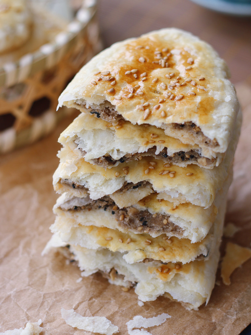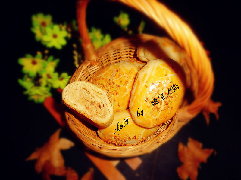 19:烘烤:设置烤箱上下火180度,预热10分钟。将少许蛋黄液刷在牛舌饼表面,再撒上少许芝麻,放入烤箱中层,烤18分钟左右。如果没有烤箱,可以将牛舌饼放在平底不粘锅中,开小火,翻面烙到两面焦黄起层就可以了。表面的蛋液和芝麻就不要放了。