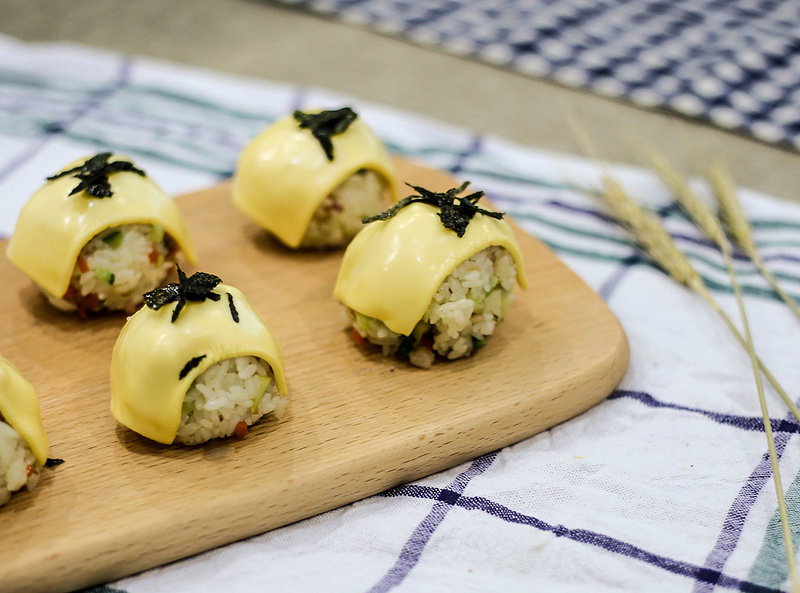 5:芝士片切成4片,覆盖在饭团表面。