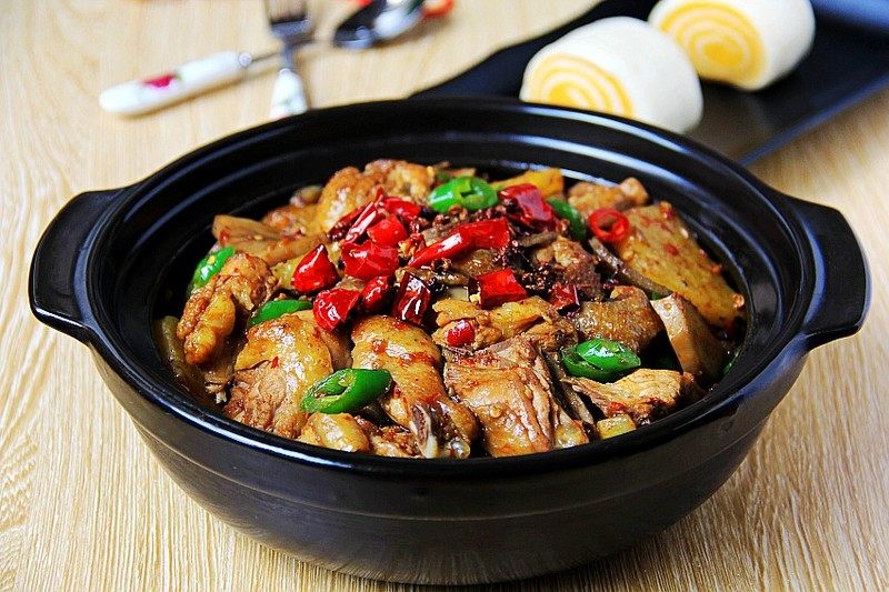 8:加入炒制好的鸡块焖煮,汤快收干时加入切成段的青辣椒,煮至青椒断生即可盛出
