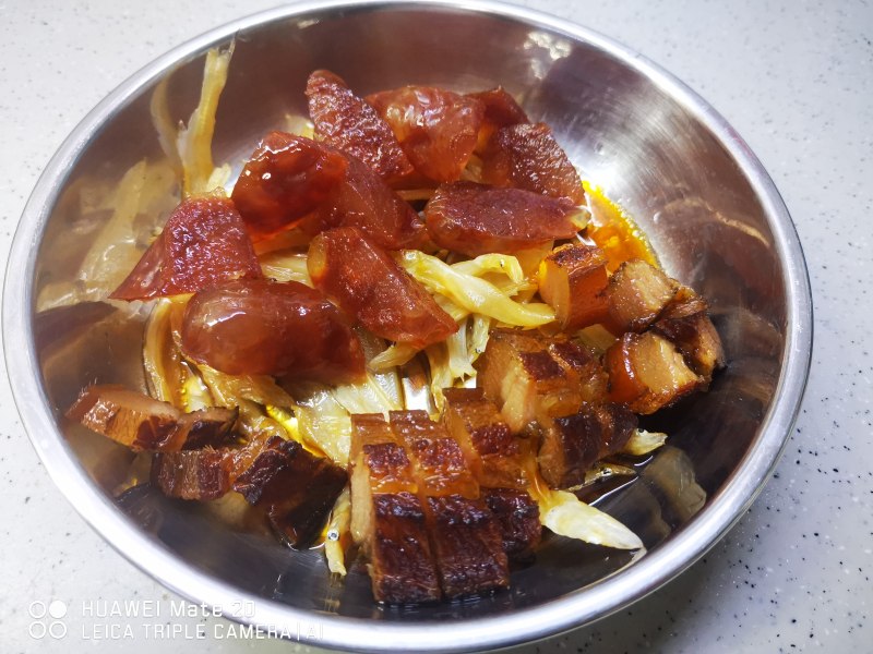 3:腊肉和腊肠均用温水洗净。切薄片,待用。(若想腊肉味道更香,可将腊肉皮一面放到火上先烧焦,称之为烧皮,再洗尽。烧时候会溅出油汁,儿时在老家,是放到火坑上烤,现在城里的液化气灶周边烧完得清理)
