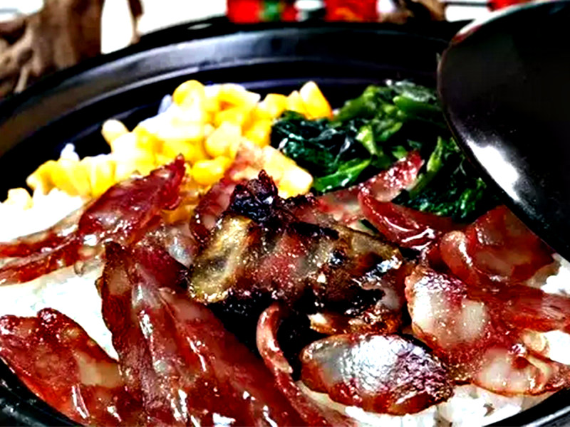 7:大米煮至8成熟时,放入切好的香肠片,胡萝卜丁,杏鲍菇丁,再盖上锅盖,沿着砂锅盖边上浇上适量食用油,小火闷2分钟;2