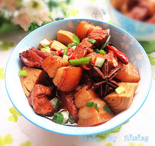 9:加白糖、盐调味,加入素鸡,继续用小火,烧至五花肉软烂。