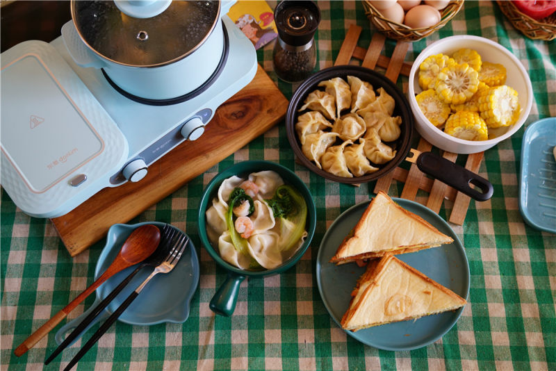 9:玉米蒸好,再下馄饨煮好,将做三明治剩下来的时蔬都可以烫一下,成馄饨汤的配料。