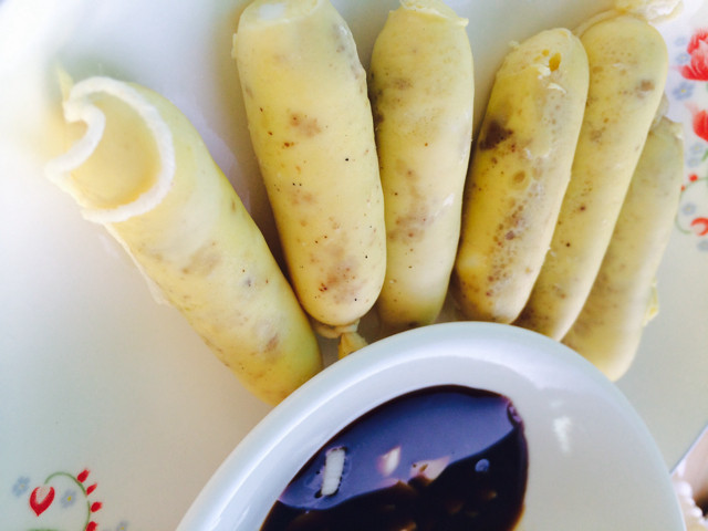 2:解冻后的牛肉肠直接吃口感不好,平底锅薄薄地刷层油,放上洗净的牛肉肠小火煎2分钟,取出备用。