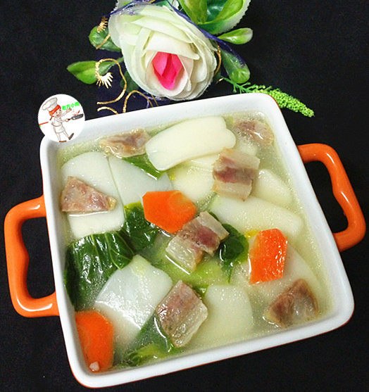 咸肉1块;青菜2棵;年糕4条;香肠半根;胡萝卜半根;