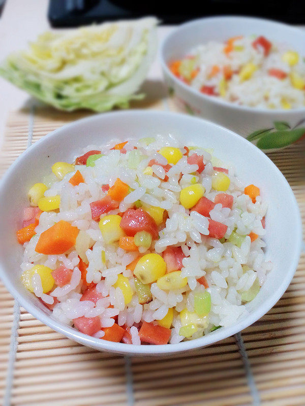 香肠半根;胡萝卜半根;芹菜1棵;熟玉米粒适量;米饭1碗;