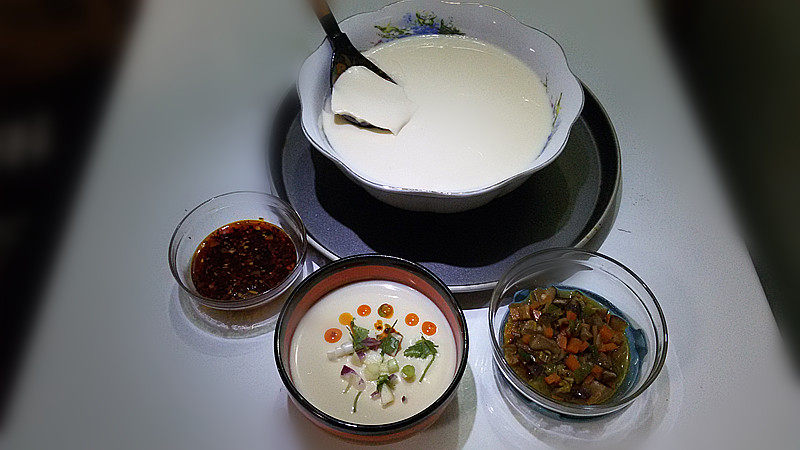 8:在豆腐脑凝固的同时,着手做脑卤,传统意义上的脑卤是木耳、黄花菜、蘑菇丫炒制,添上鲜汤或水,用酱油调制,淀粉勾芡,出锅前淋上蛋液浇盖在豆腐脑上,撒些蒜末、香菜末、辣椒油、香油本人加以改良,用鸡蛋小炒圆葱丁、胡萝卜丁、木耳、黄花菜、香菇、青尖椒,用海鲜酱油调制大酱,加入鸡骨架汤,营养更合理另备小料:葱末、香菜末、蒜泥、辣椒油、香油