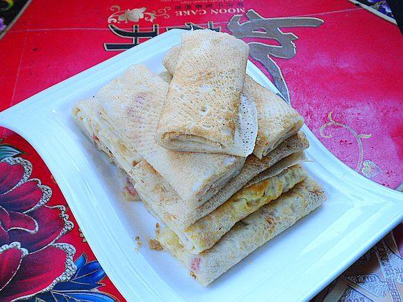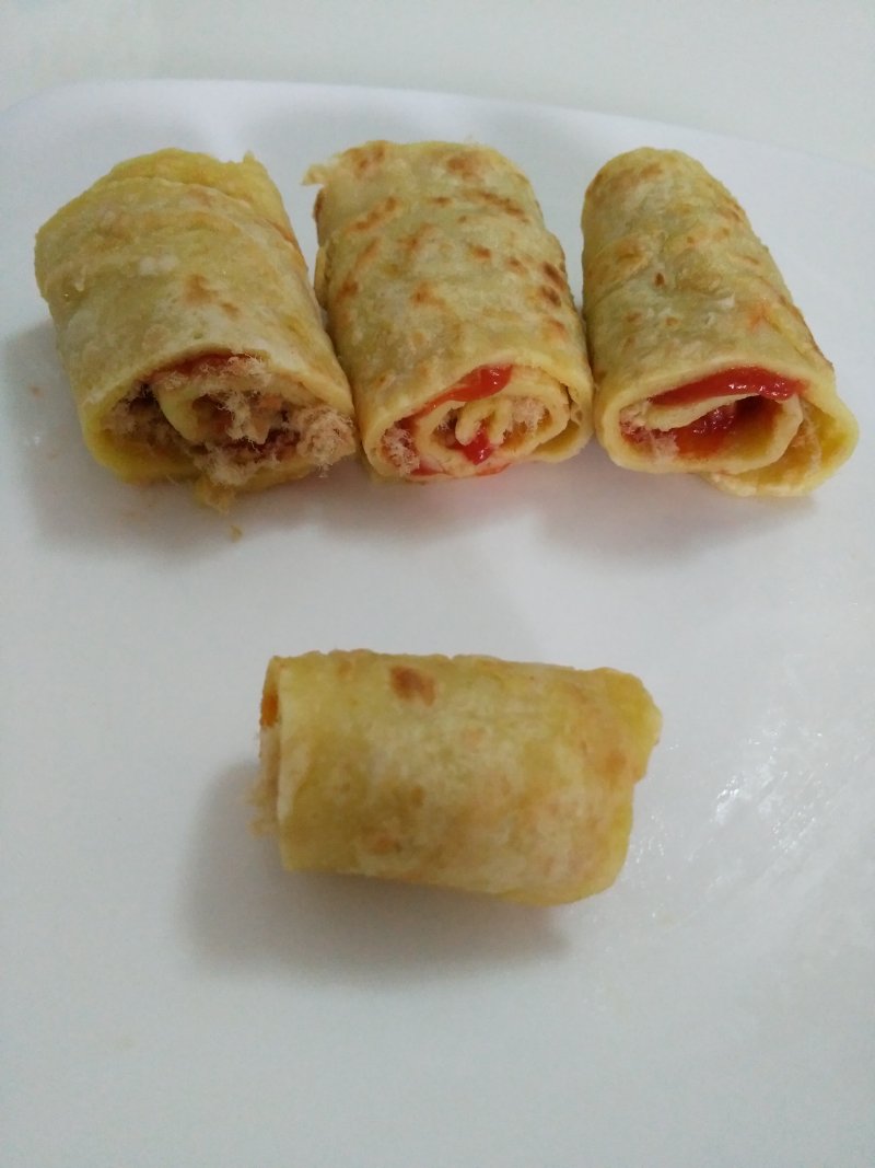 1:鸡蛋饼切成条,铺上一层番茄酱,一层肉松