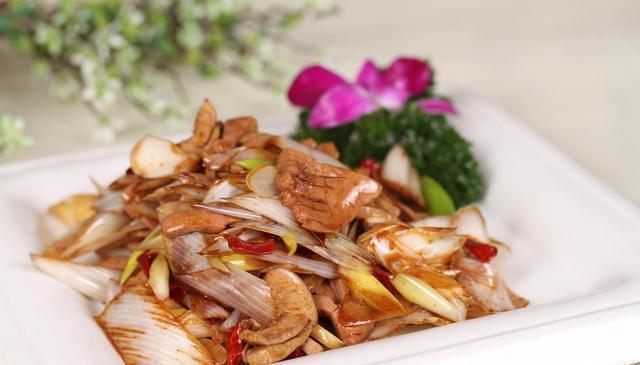 爆香泡姜泡椒,下大葱段炒至微软。猪肝回锅,沿锅边淋半勺生抽,大火翻炒10秒出锅。