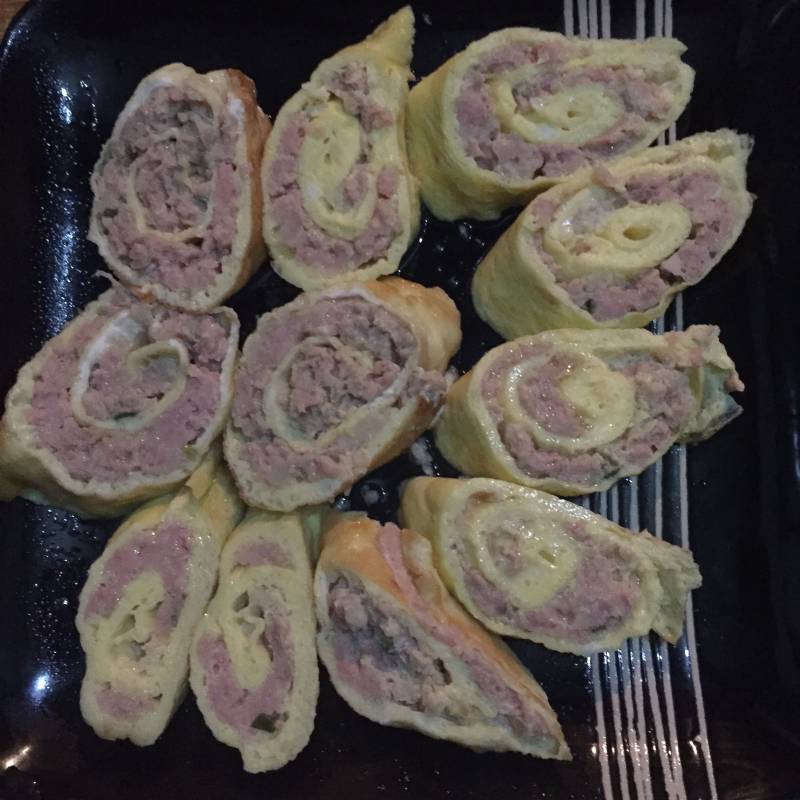 4:将蛋皮倒在案板上,将肉糜铺在蛋皮上,稍微薄一点,最右侧留少许空间
