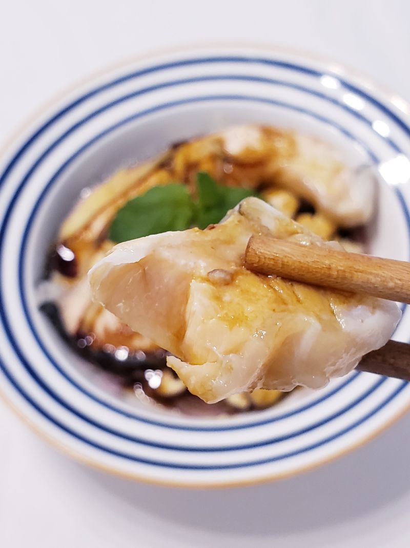 5:根据自己口味,把1~2勺柠檬蒸鱼酱油淋在三文鱼上,取鱼肉蘸着味汁吃。
