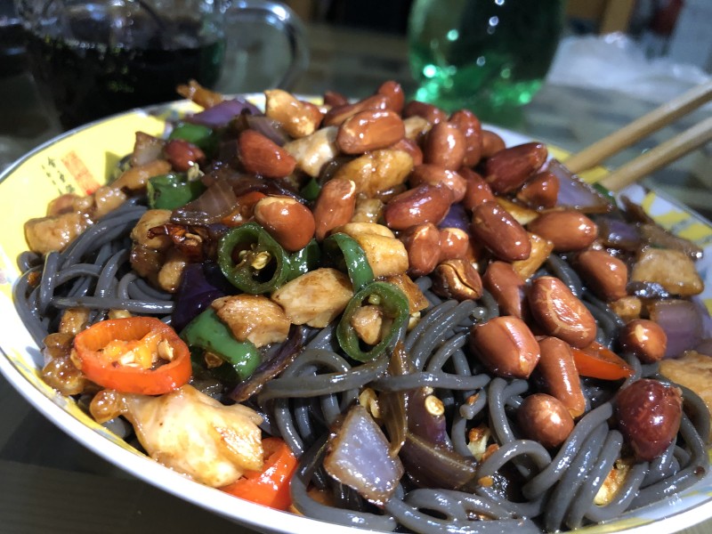 11:把炒好的鸡丁倒在蕨根粉上,再撒上酥脆的花生。