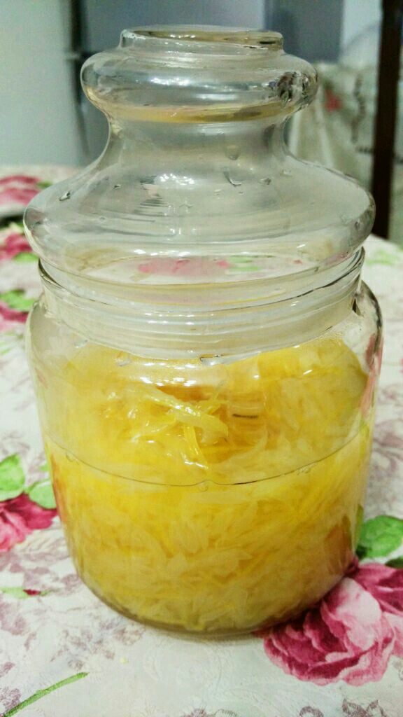 3:再把柚子皮切成细丝,用淡盐水泡上几小时,然后将泡过皮的水倒掉,你会发现水面上还有一些残留的一些果蜡,多漂洗几次就没有了,也可以用开水焯一下(果蜡是不溶于水的)