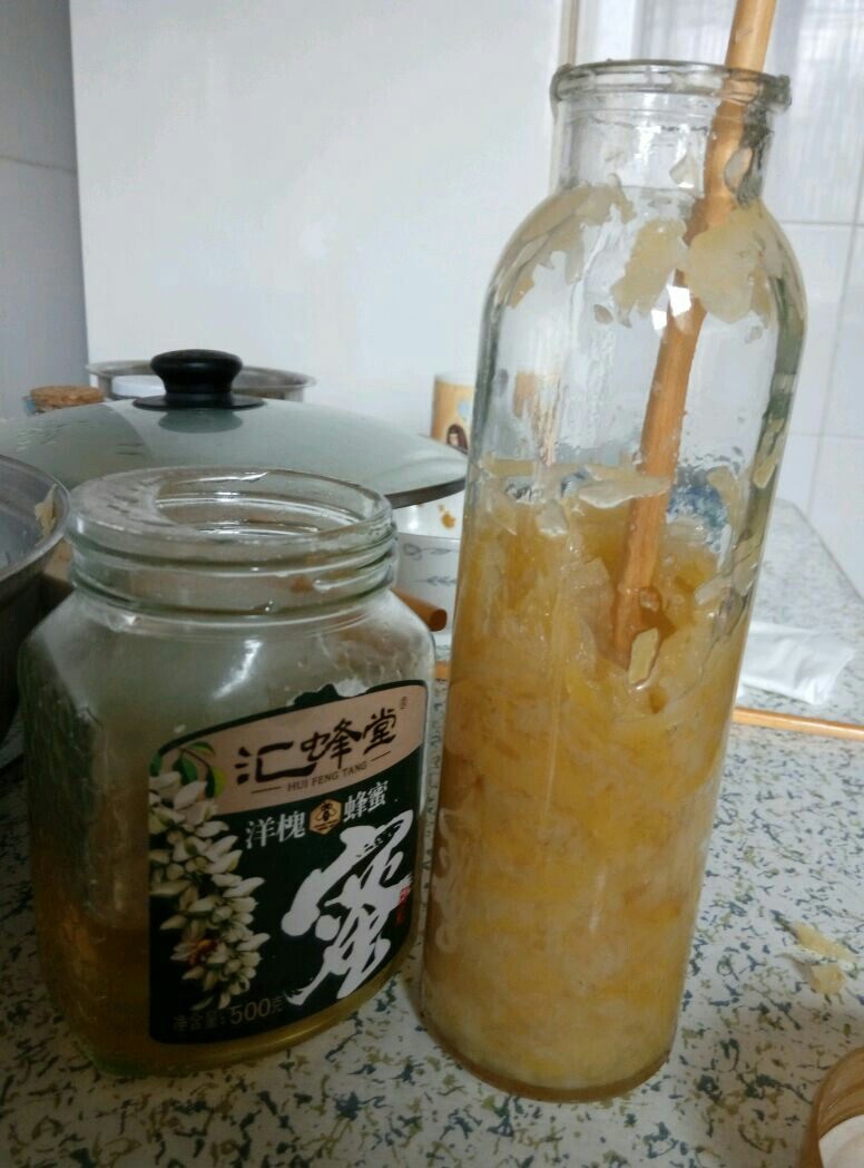 9:熬好以后放凉,加上蜂蜜拌匀,放干净的瓶子里保存,吃时舀上一些柚子茶,加入温开水冲入即可