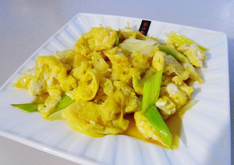 6:炒制大葱塌秧,放入备用的鸡蛋。