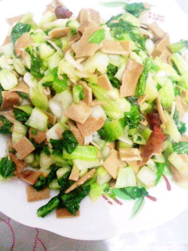 4:锅里放油,放入干辣椒段爆香。倒入油菜和五香豆腐片(临时加的),炒一两分钟,出锅。很不错的小咸菜。