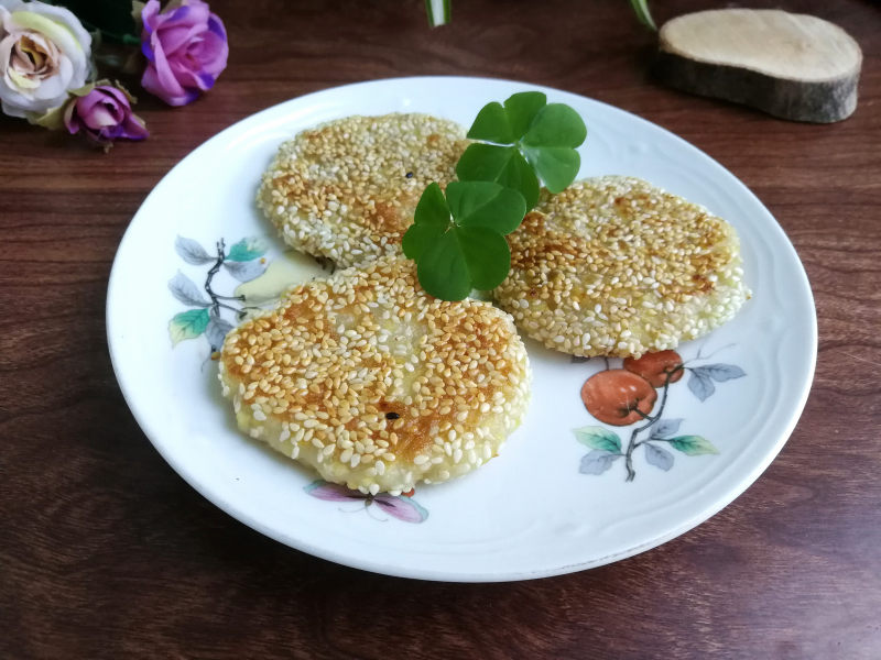 12:锅中涮上少许食用油,放入糯米饼,淋上少许温水,盖上盖子小火焖煎至双面金黄即可。