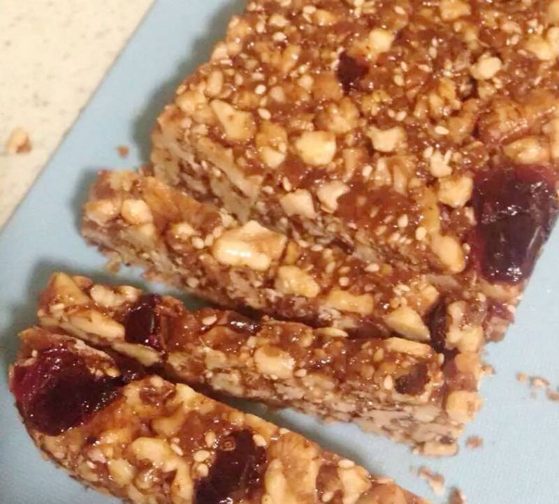 3:不停翻炒,一直要核桃全部裹上糖即可以然后倒入盒子定型,自然冷却至温热后切成条状!