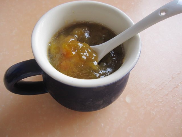 1:我之前做好的橘子罐头,用罐头瓶装好保存的。取了一瓶比较满的,重量是230克