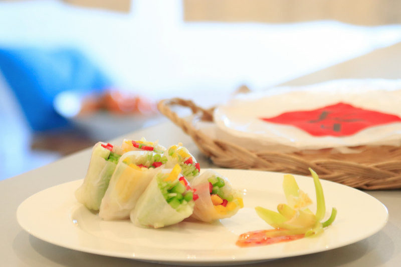 5:为春卷造个型,突出五彩缤纷的蔬菜层次。