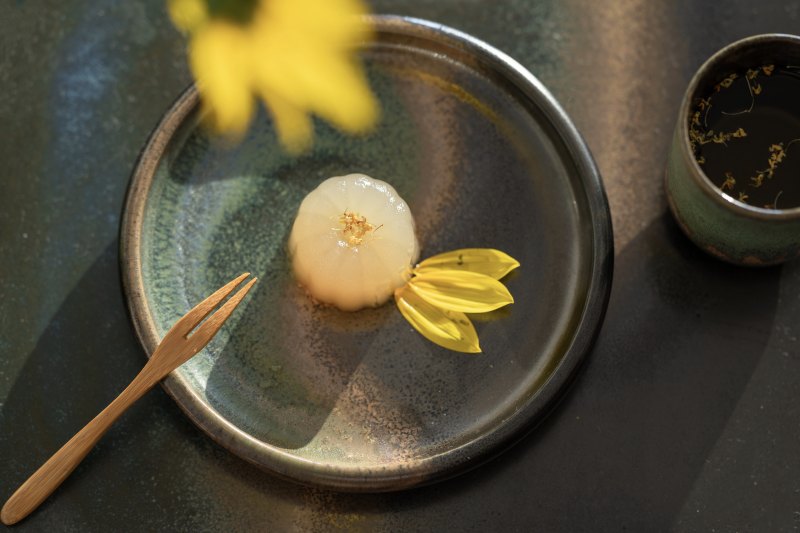 12:待其凝固定型后取出脱模,洒适量干桂花摆盘。