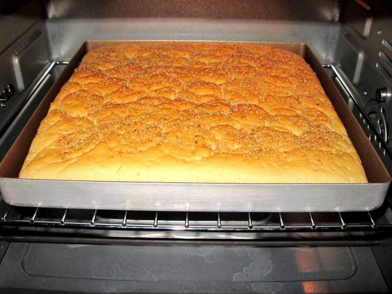 9:烤箱230度预热十分钟,放入烤盘烤至一面金黄(大约十分钟),取出烤盘,锅盔表面刷上一层薄薄的植物油,翻面后再放回去烤至表面金黄(大约10分钟),然后再次取出烤盘,在锅盔表面刷一层薄薄的植物油,翻会正面,再次放入烤箱烘烤5-10分钟即可。