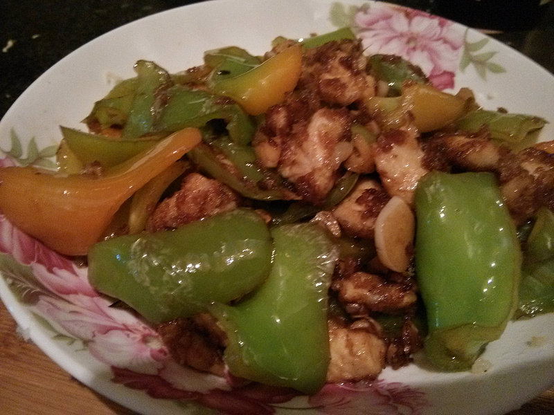 6:青椒炒熟后把鸡柳倒入锅里,加点酱油,炒均匀即可