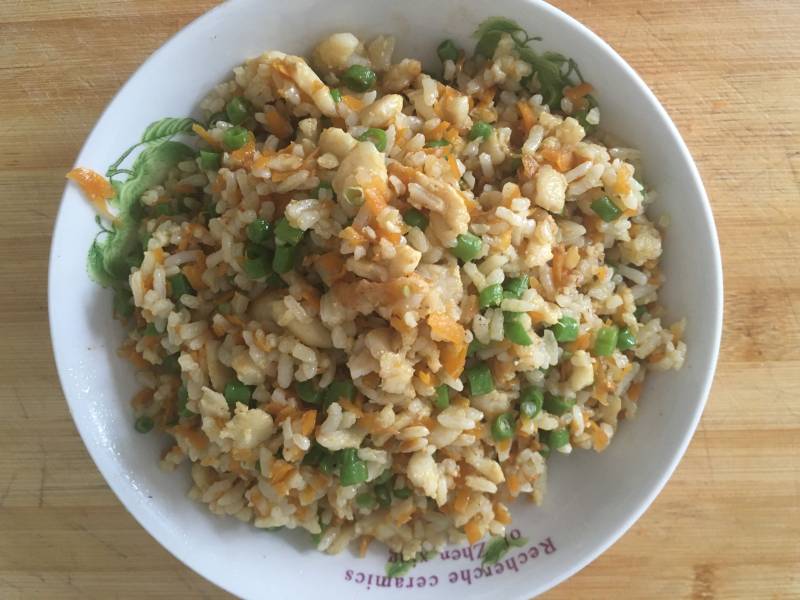 8:加入煮好的米饭,充分炒匀,不用加什么佐料了,很鲜美,给小孩吃的,少加佐料较好