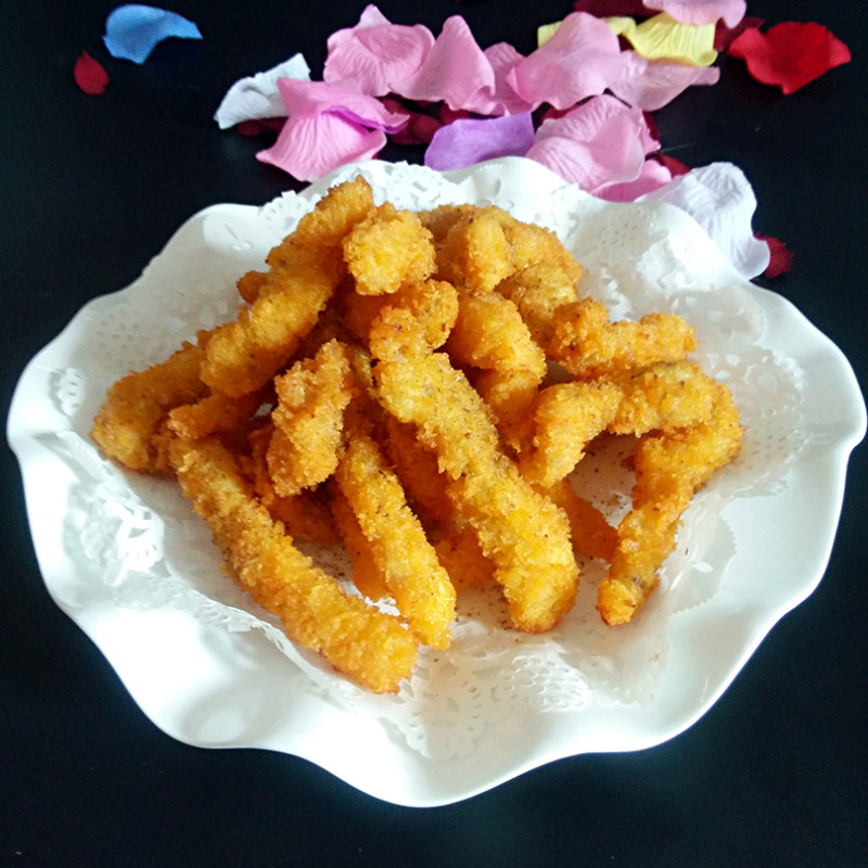 8:炸至鸡柳熟透,酥脆、颜色金黄,控油捞出。