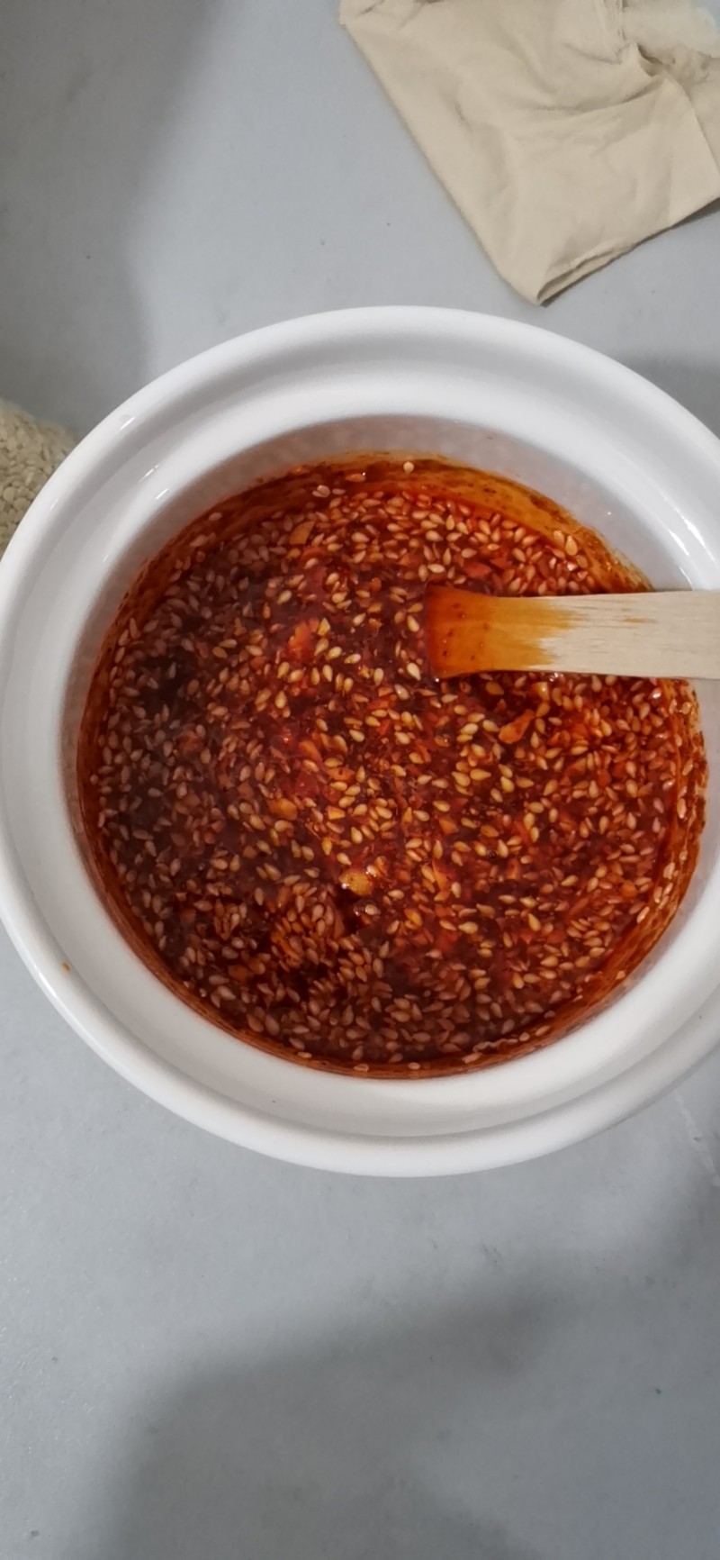 1:容器要擦干,不要有水,要耐热的容器。辣椒面白芝麻随意放,大颗一点的辣椒碎也可以。一点点花椒粉,一点点白糖。