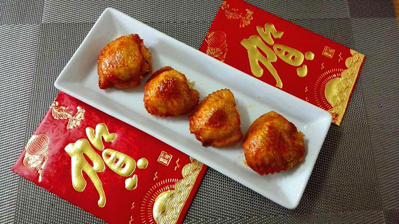 8:取一块鸡翅,将糯米饭团塞入里面(如图所示)