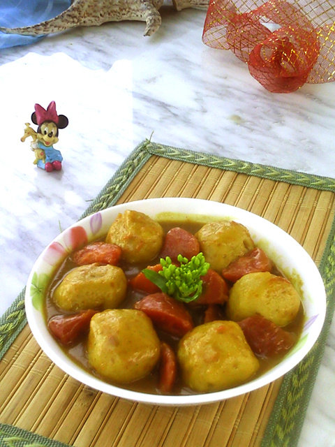 以前做的时候都是用咖喱粉,那样吃起来的时候总有卡粉的感觉,不舒服,这次用咖喱块,感觉还不错哦~而且咖喱块是调好味的,什么都不用下了,这样做的咖喱鱼丸的汤汁捞饭吃也是非常好吃的哦~~鱼丸大多都是粉下的多的,看个人口味哈,喜欢吃原来的可以放原来的那种哈,鱼豆腐也可以这样弄哦~这里因个人喜欢我是用墨斗鱼丸哦,吃起来不会粉粉的,有嚼劲