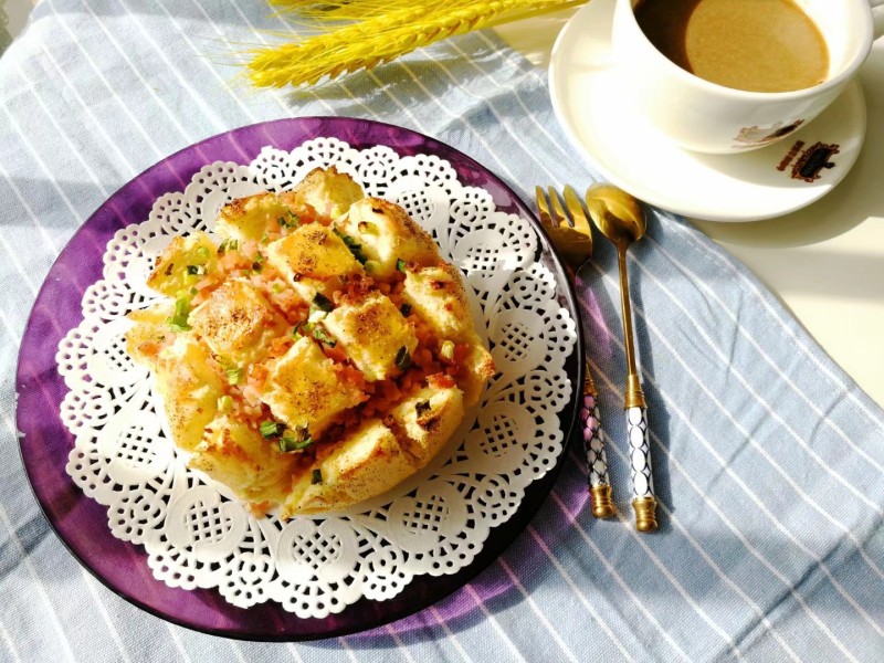 9:面包的香脆配上芝士火腿的浓郁香甜,还能拉丝,让这馒头的地位秒变精品点心,再冲上一杯拿铁咖啡,怎么能不为这道美味好看的早餐心动呢。
