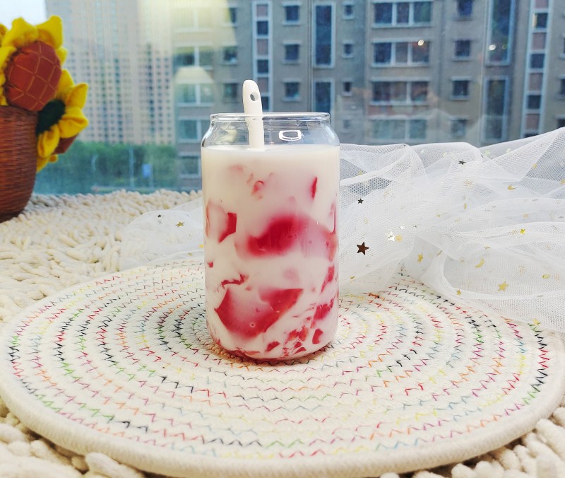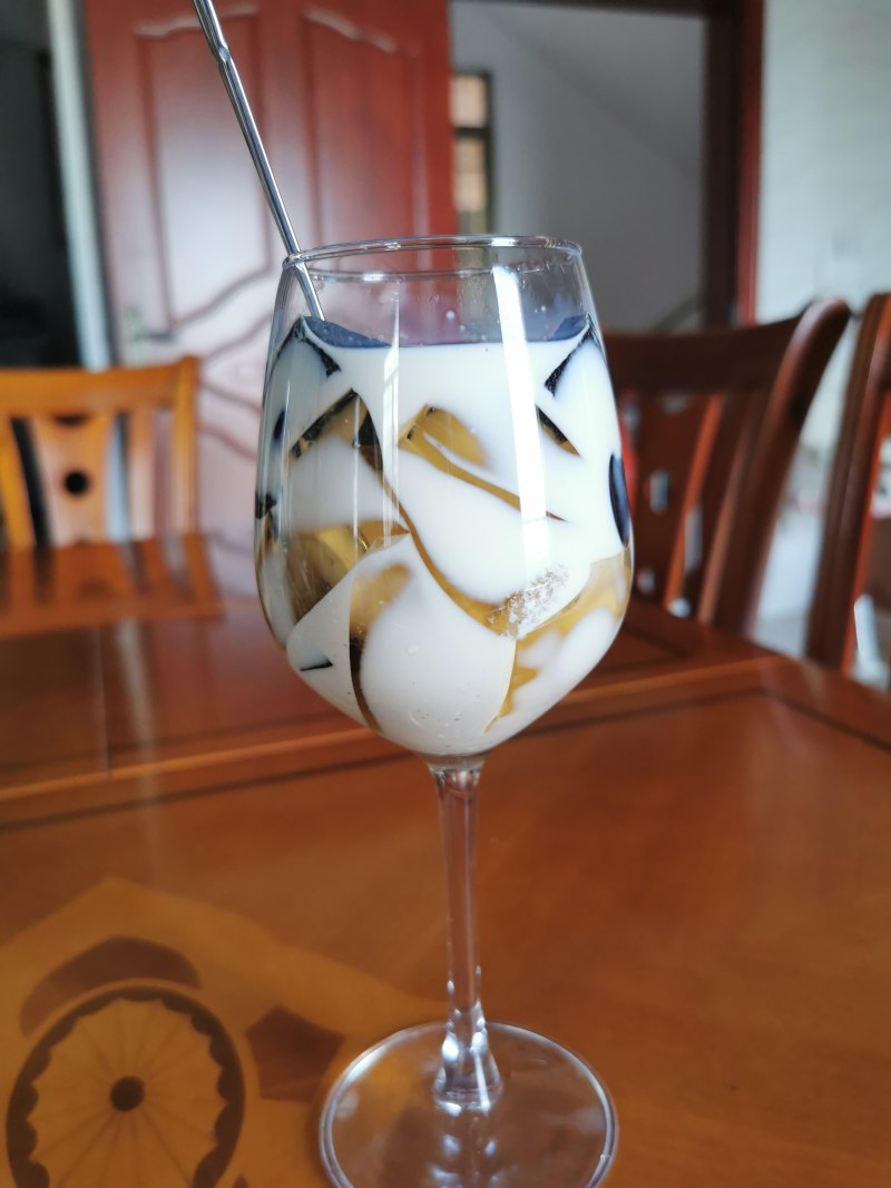 12:加入纯牛奶,用筷子把果冻搅成小碎块,方便用吸管吸。
