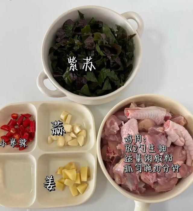 三黄鸡半只(约500克,选嫩鸡更易熟)、新鲜紫苏叶1小把(约30克,干紫苏也可,需提前泡软)、姜3片、蒜2瓣、生抽2勺、料酒1勺、盐少许、食用油适量