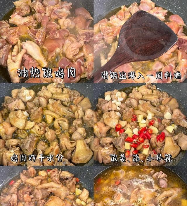 4. 热锅倒少许油,放剩下的姜片、蒜块炒香,倒入焯好的鸡块,中火翻炒2分钟,炒出鸡肉的香味;