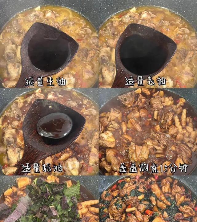 6. 加小半碗清水,大火烧开后转小火焖8分钟(鸡块熟透即可,别焖太久,肉会柴),最后放紫苏叶、少许盐,翻炒30秒,紫苏出香就关火。