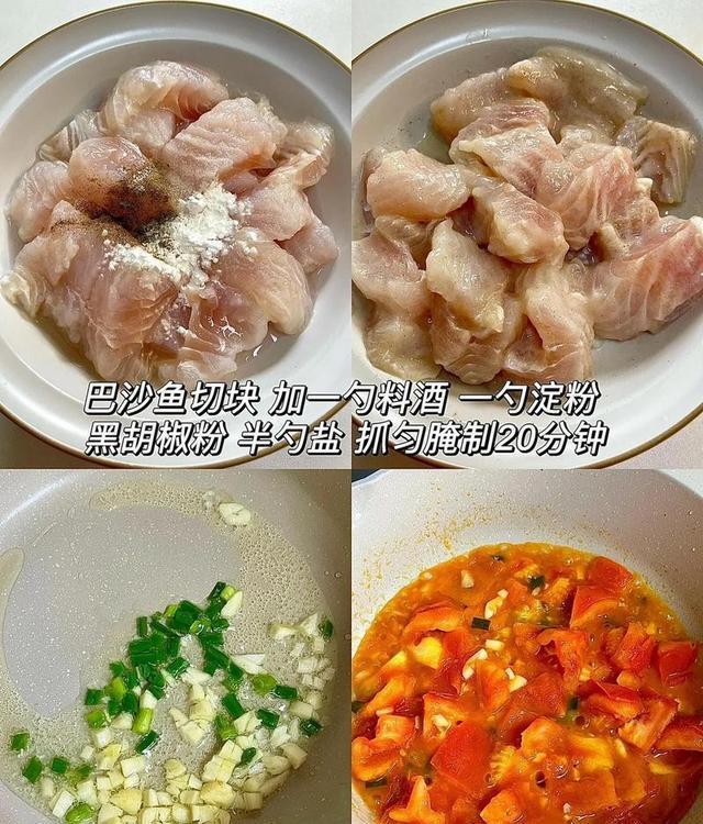 1. 巴沙鱼柳切成2厘米厚的块,加少许盐、白胡椒粉抓匀,腌5分钟;