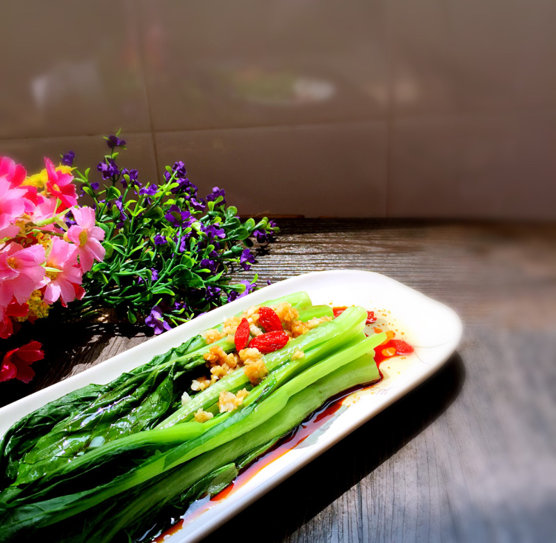 4:烧锅倒油烧热,下入切好的广东菜心翻炒翻炒至断生。