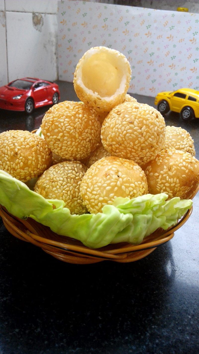 炸煎堆的关键不在制作饼胚上,很多人都非常苦恼的油炸过程掌控不了油温。而把辛苦的劳动成果炸的面目全非,甚至有人堪称“炸弹”不堪入目,心情自然好不了。其实炸煎堆并没有想象的那么难。只要全程小火炸制,万一炸的过程油温太高了,中间可以马上关火,等油温降下来再继续炸,火候太大炸出来的煎堆容易膨胀过度,开裂露馅,要想炸出色泽金黄的煎堆,火候和油温是关键。还要有耐心。一边炸一边观察。灵活调整火候。就能做成满意的煎堆啦!