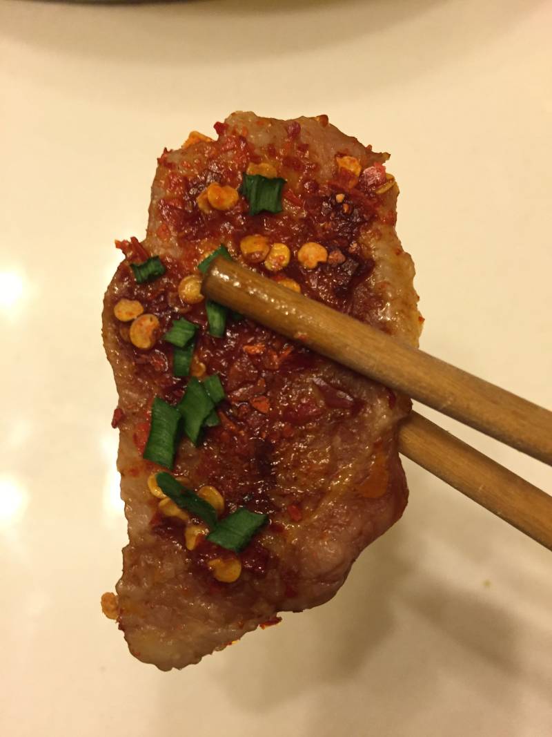 3:拿出烤盘,每片肉洒上葱花,少许花椒粉,回烤箱烤一分钟拿出