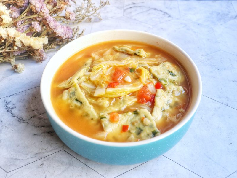 11:再次煮沸后倒入白菜叶,直至面片煮透煮熟,面片中心无白心;