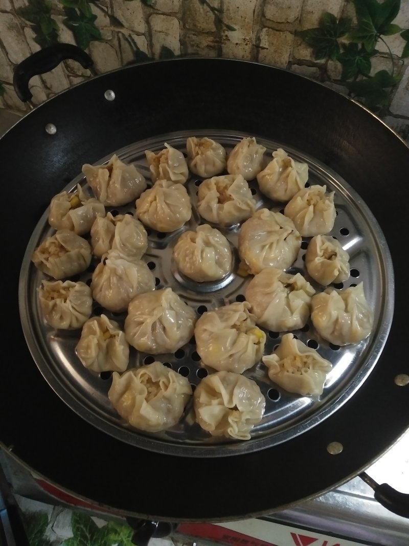 4:将炒好馅料包入水饺皮内,大小可以根据自己喜好,蒸锅内水烧开,放入烧卖蒸10分钟即可