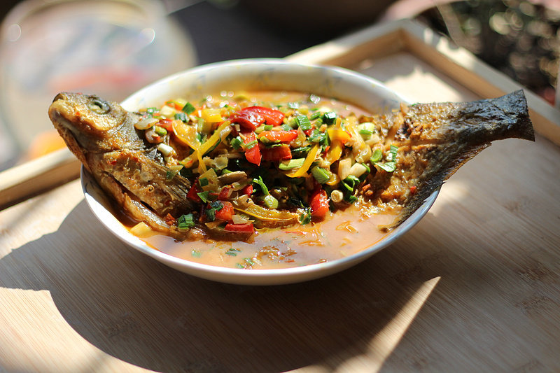2:沥干的鱼入锅煎至两面黄,起锅,锅里放底油,炒料放水烧开之后放入鱼,汤汁要没过鱼,煮熟后起锅。