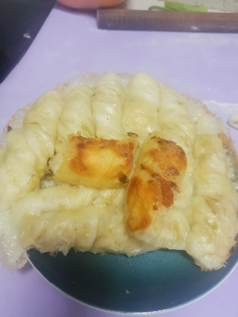 7:平底锅刷油,放入面剂醒十分钟,盖上锅盖小火慢煎。