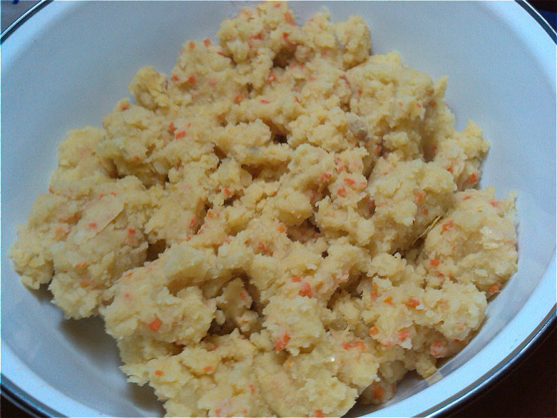 8:把炒过的胡萝卜和土豆泥都倒进鸡蛋液里